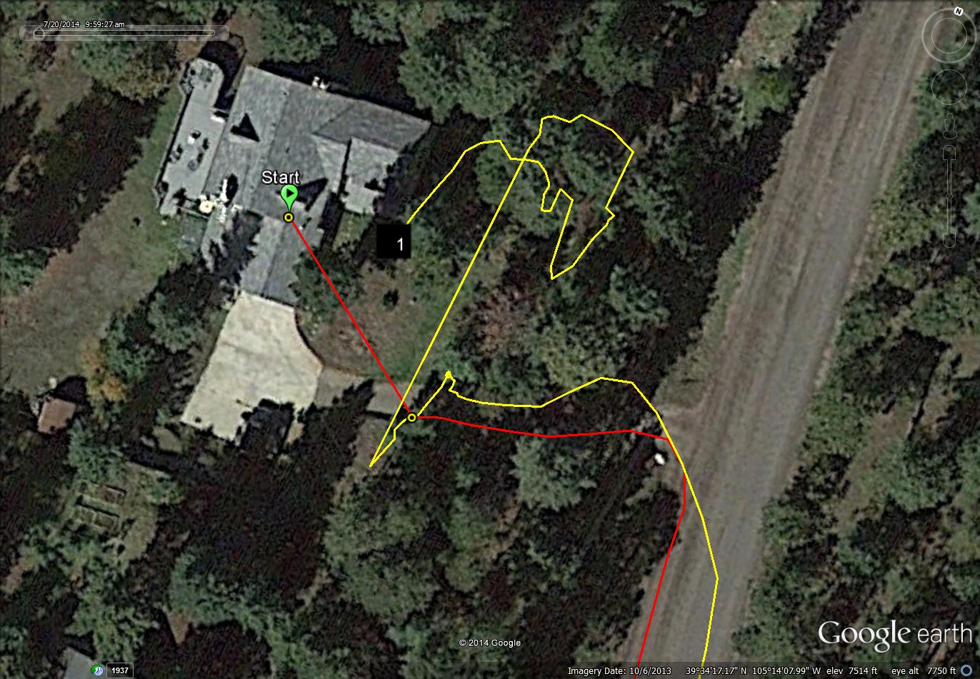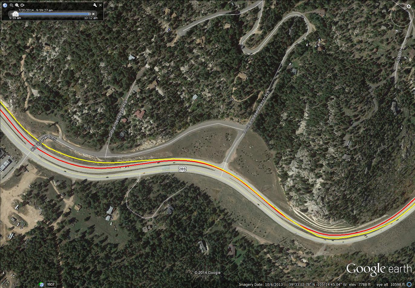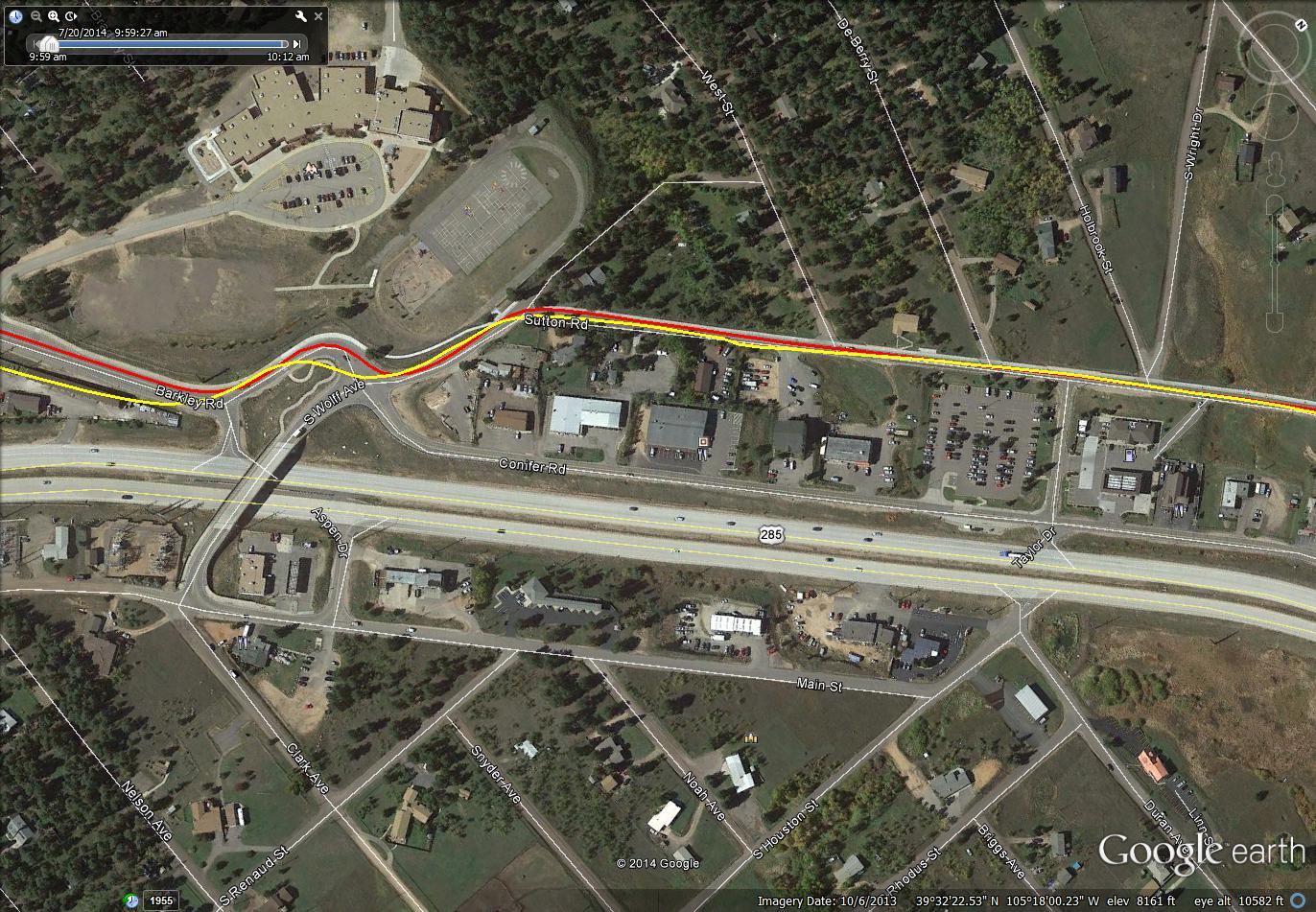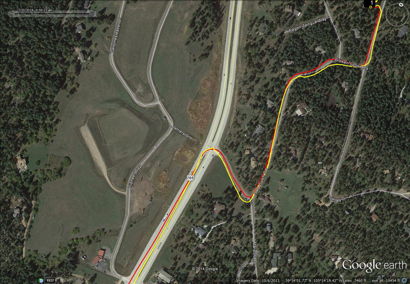 These snapshots from Google Earth have overlaid on then two GPS tracks. One from a Garmin Edge 510, the other from a Sony AS30V action camera. The yellow trace is the Sony, the red trace is the Garmin. They are provided here so one can see the poor performance of the Sony GPS versus the Garmin.