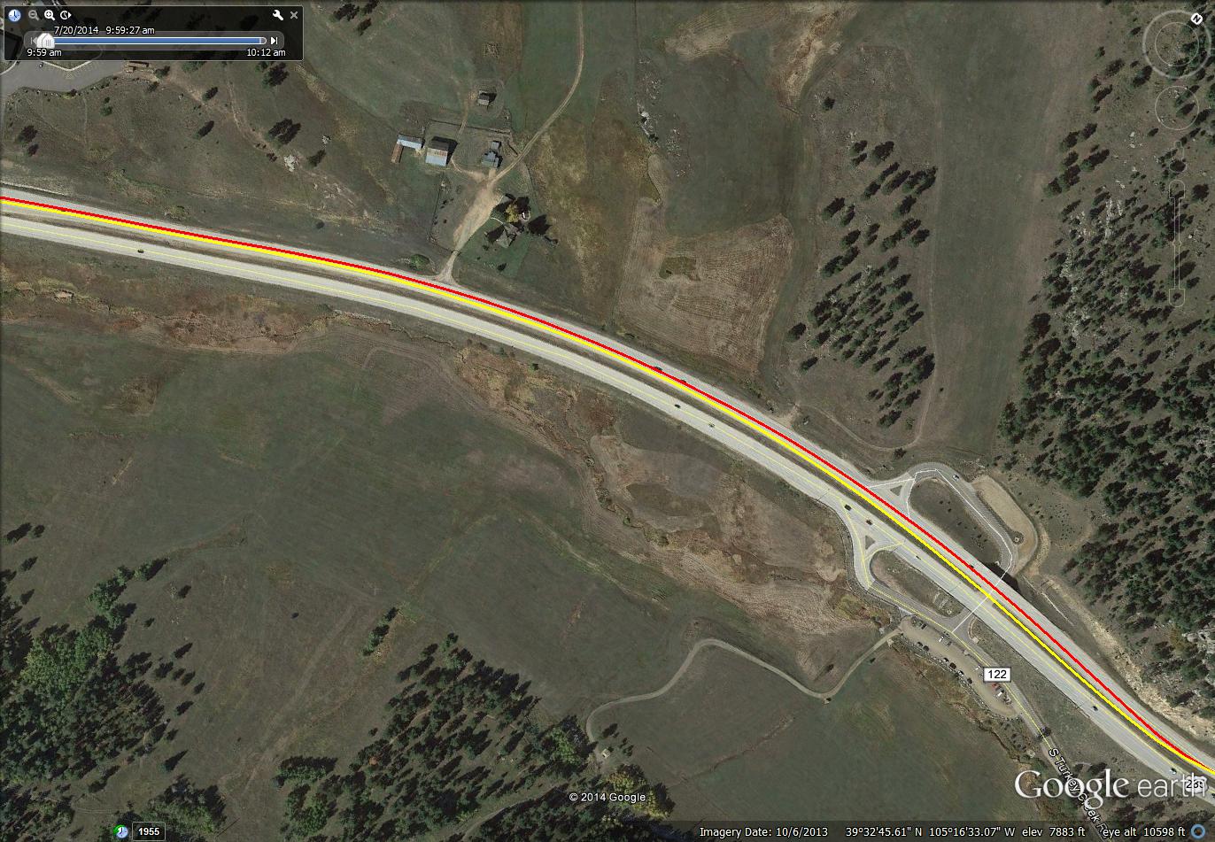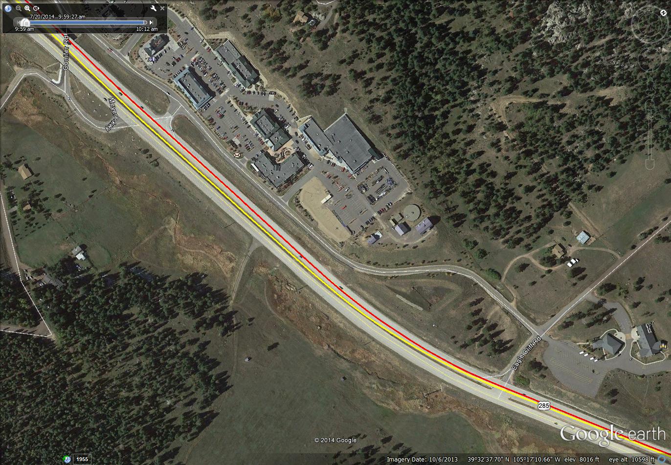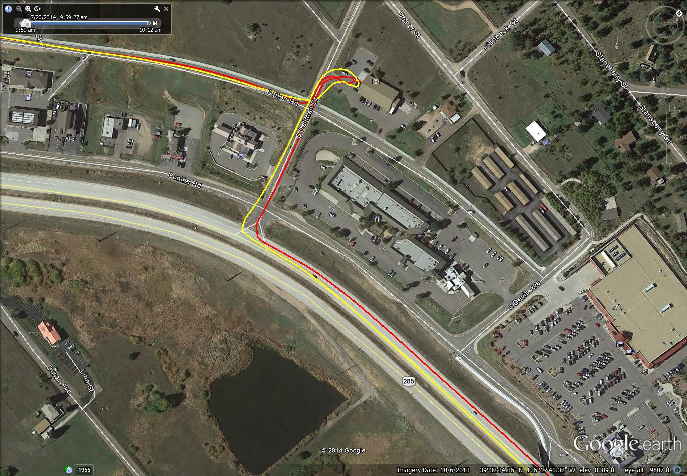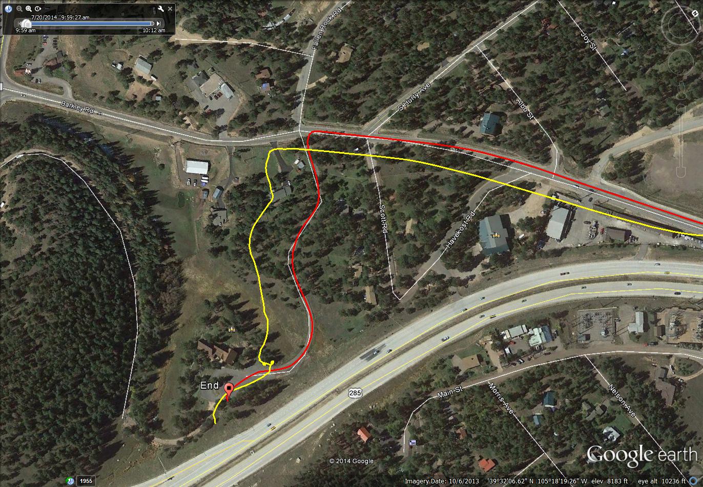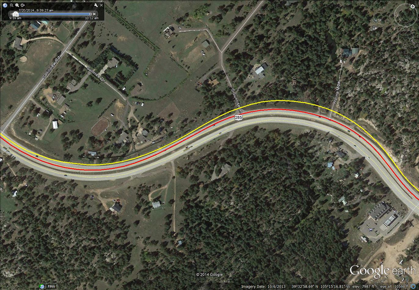 These snapshots from Google Earth have overlaid on then two GPS tracks. One from a Garmin Edge 510, the other from a Sony AS30V action camera. The yellow trace is the Sony, the red trace is the Garmin. They are provided here so one can see the poor performance of the Sony GPS versus the Garmin.